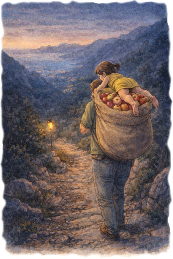 Papà, addirittura, trasportava sulle spalle un enorme sacco — credo almeno trenta chili — pieno di mele non destinate alla tavola, ma agli animali da cortile. In mano aveva anche diverse buste.