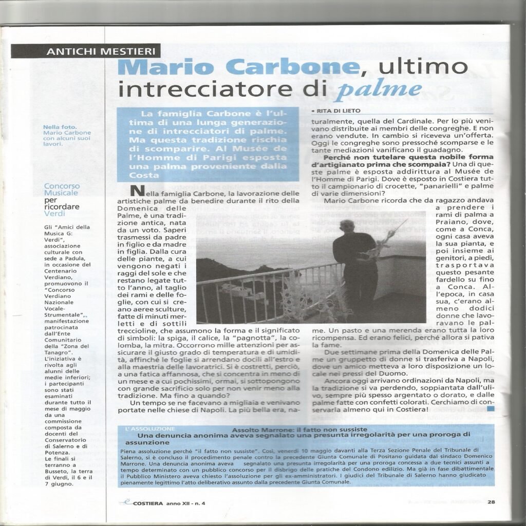 Lo devo soprattutto alla memoria di mio padre, Mario Carbone, che è stato l’ultimo vero “palmaro”: colui che, conoscendo profondamente questa antica tradizione, tramandata di generazione in generazione, con tenacia e ostinazione, ha continuato a praticarla e a insegnarla a noi figli e a chiunque desiderasse impararla, finché le forze glielo hanno permesso.